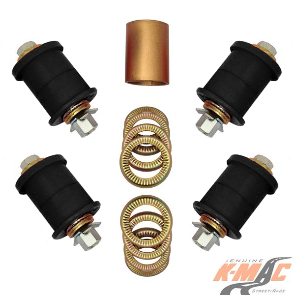 * ALSO SEE COMPLETE RANGE OF “FRONT AND REAR PRECISELY ADJUSTABLE CAMBER, CASTER, TOE BUSHINGS ” All the very latest K-MAC design breakthroughs to resolve premature bush wear. Most bushings feature twice the load bearing area of OEM and are 2 axis / self aligning – without the use of air voids. Result is improved brake and steering response. The Camber, Caster and Toe bushings are also precisely adjustable (unique K-MAC patented design – single wrench on car, allowing accurate adjustment “under load” direct on alignment rack). With the “Camber” bushings providing also “extra” track width (and negative adjustment) on race days.