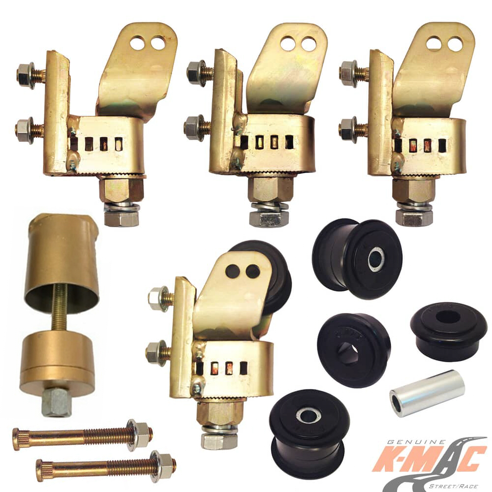 (Set of 4) Genuine K-MAC FAST “RATCHET” ADJUST. CAMBER & CASTER BIGGEST, QUICKEST, STRONGEST ADJUSTMENT SYSTEM. WITH SELF ALIGN MOUNTS FOR EXT. WEAR LIFE. ALSO INCLS. BUSH EXTRACTION TOOL !