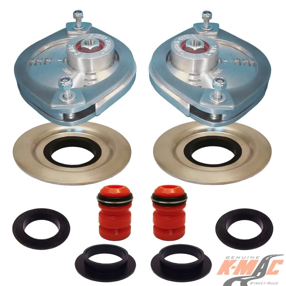 ANOTHER KMAC UPDATE INCORPORATED INTO THE DESIGN: Separate radial thrust bearings to take the “Steering Loads” (which also resolves annoying spring drag/ noise/ binding). Massive 85mm (3 3/8″) diameter fully sealed bearings (again by far biggest in the industry) and also included are OEM diameter alloy top spring seats (along with separate seats to suit all brands of coil overs 60-70mm I.D.).