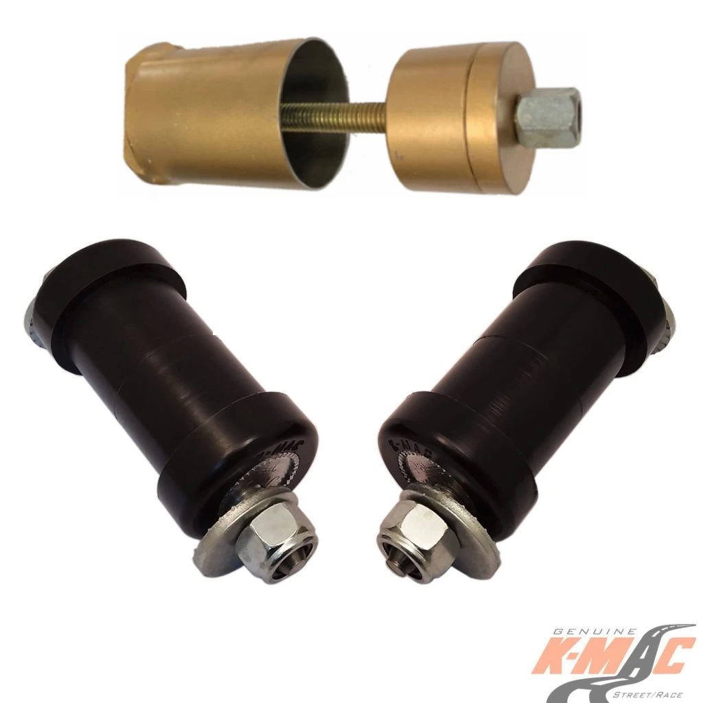 THE ABOVE KMAC Unique design “MONO BALL / 2 Axis / Self Aligning bushes” besides having “two and a half times” the load bearing / impact area of OEM also supercede / outperform short life delrin bushes or often used small sized “steel spherical bearings” – that with their wafer thin Teflon liners soon pound out.