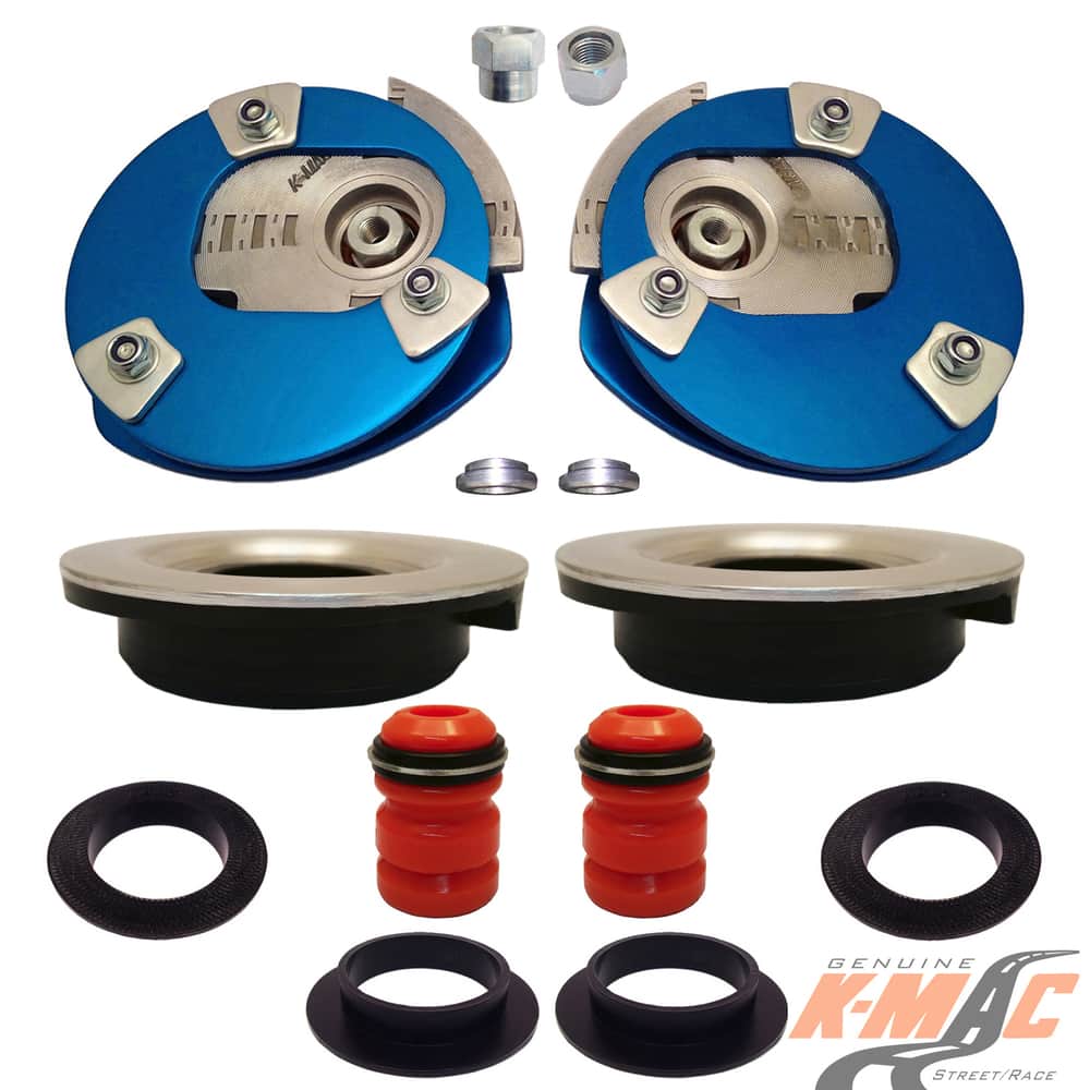 FEATURES / ADJUSTMENT RANGE: Replaces the existing Strut Top Mounts (no modifications). Reinforcing the strut towers and with the unique KMAC patented design providing the biggest (and quickest) adjustment range of both Camber and Caster. Street/Race settings can be recorded and changed in 30 seconds – just the time taken to loosen the 3 top mount nuts. Another KMAC Patented design feature allows this fast adjustment to be made accurately (under load) direct on alignment rack.